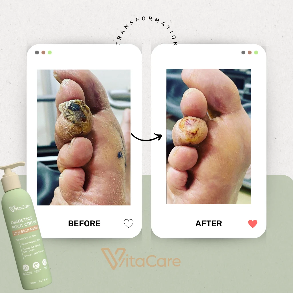 Kebiasaannya Kulit Kaki Diabetis Akan Mengalami Tompok-tompok Hitam Dan Kasar, Maka Kandungan Lactic Acid dalam Vitacare Berfungsi Untuk Menanggalkan Sel Kulit Mati.