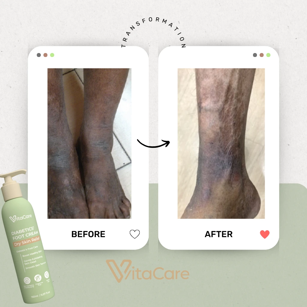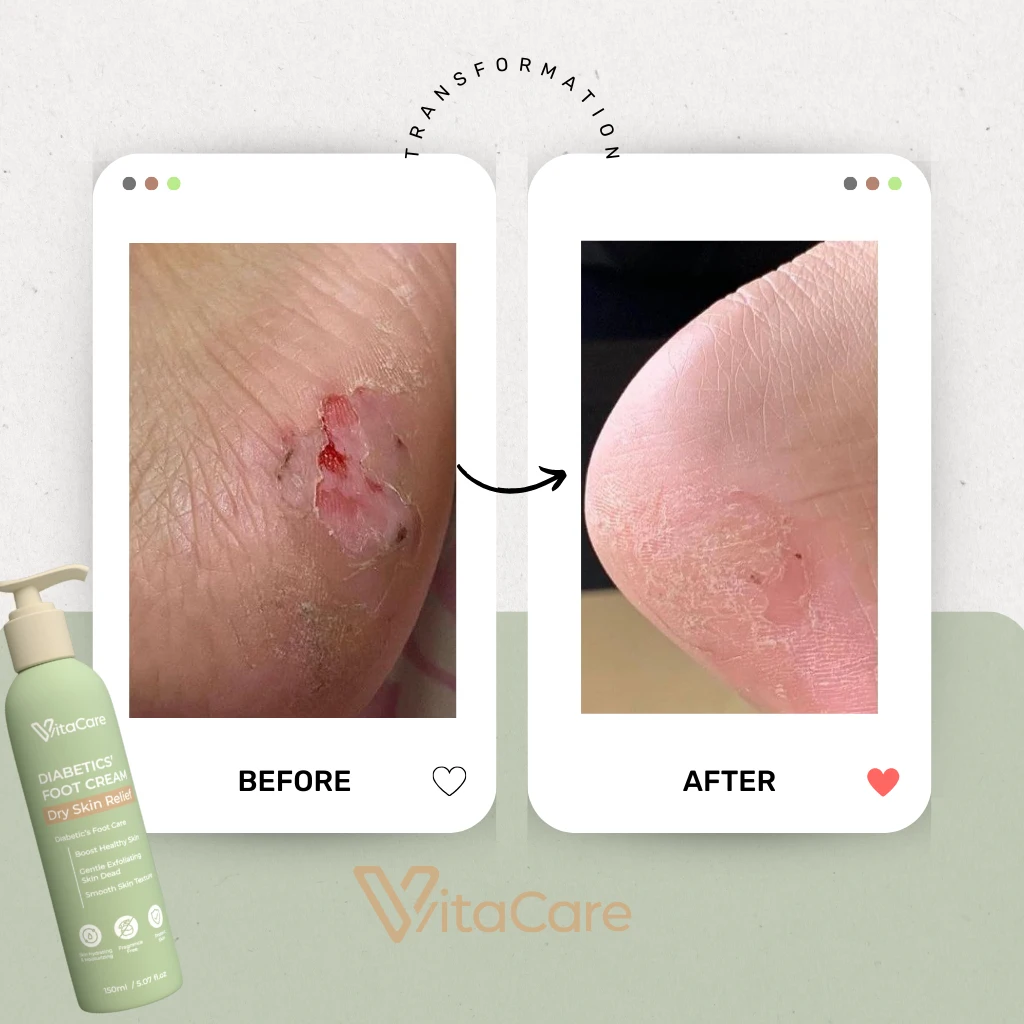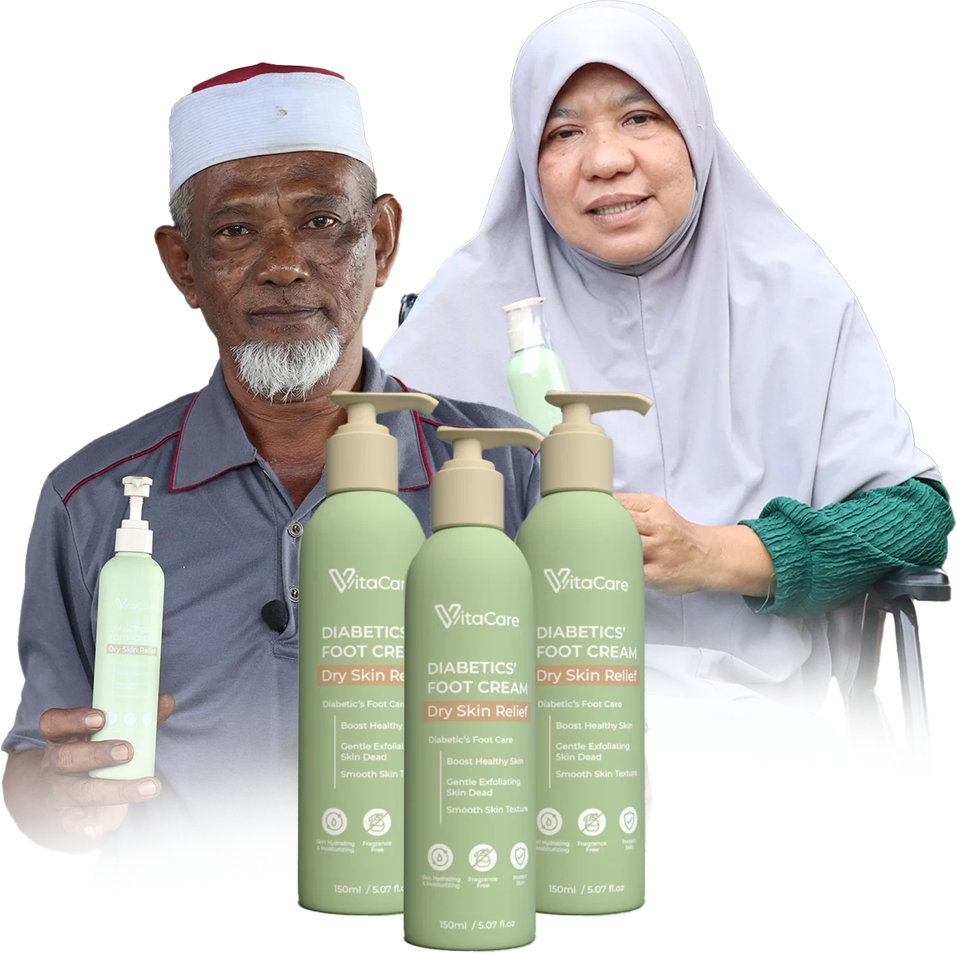 Hampir 80% Pesakit Diabetis Mengalami Komplikasi Masalah Kulit Kering,Bersisik,Gatal Dan Merekah. Aloe Vera Dan Ceramide dalam Vitacare Akan Memastikan Kulit Kaki Pesakit Sentiasa Dalam Kondisi Lembap dan Sihat