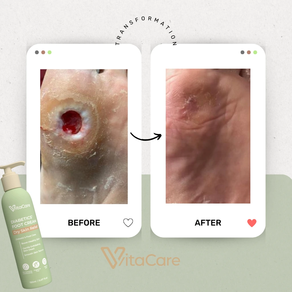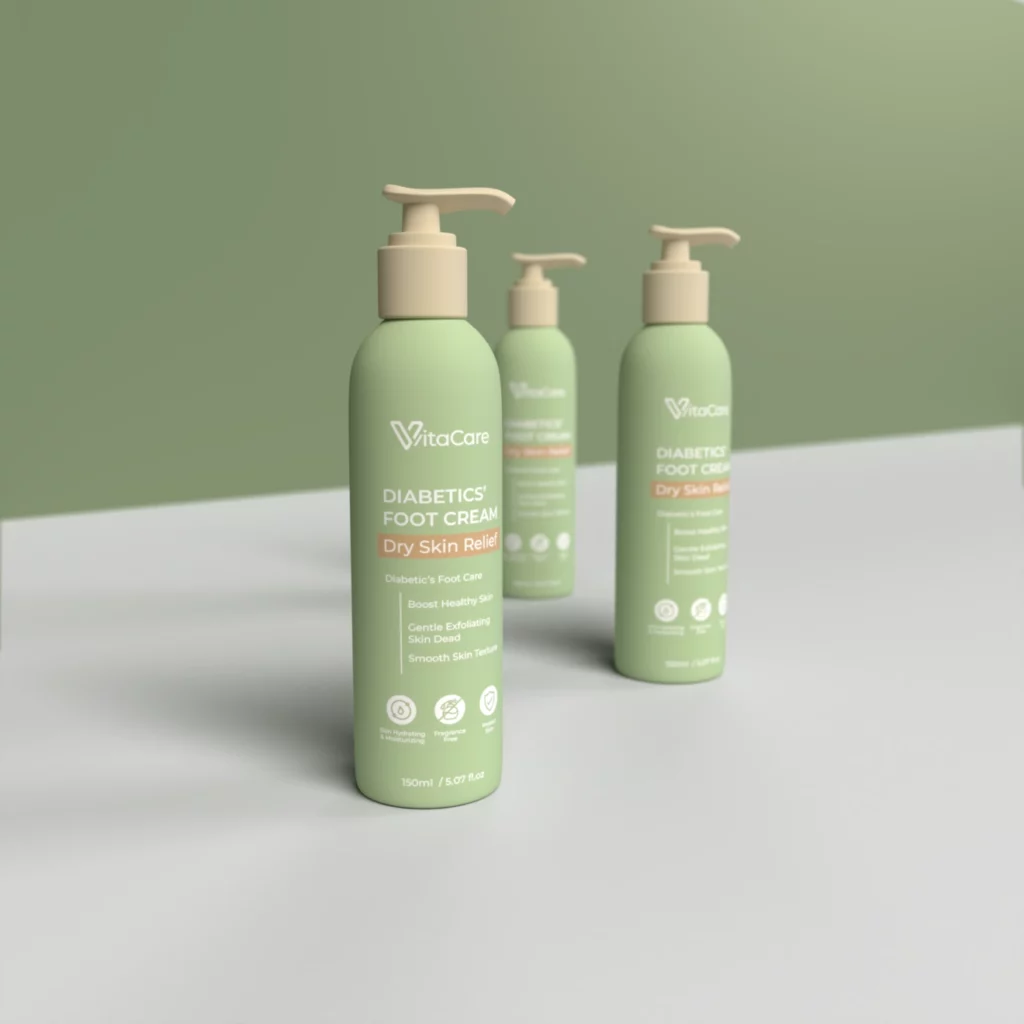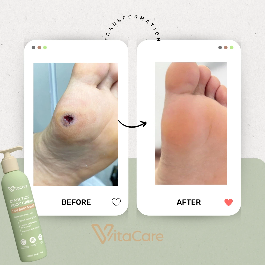 Hampir 80% Pesakit Diabetis Mengalami Komplikasi Masalah Kulit Kering,Bersisik,Gatal Dan Merekah. Aloe Vera Dan Ceramide dalam Vitacare Akan Memastikan Kulit Kaki Pesakit Sentiasa Dalam Kondisi Lembap dan Sihat