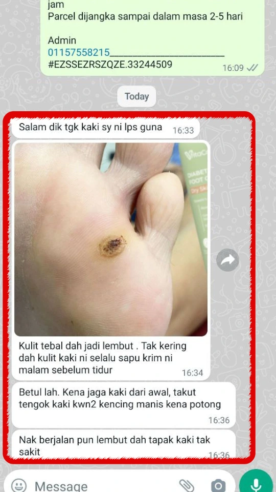 Rasa gatal garu sehingga luka dapat diatasi, kulit kaki sentiasa lembap dan nampak sihat. 4-5 hari dah nampak perubahan.