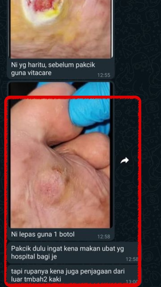 Pesakit kronik kencing manis yang pernah dipotong bahagian kaki kini kembali sembuh dan sihat. Boleh berjalan dan membuat aktiviti harian seperti biasa. Jiran-jiran pun terkejut dengan keadaan yang makin sihat